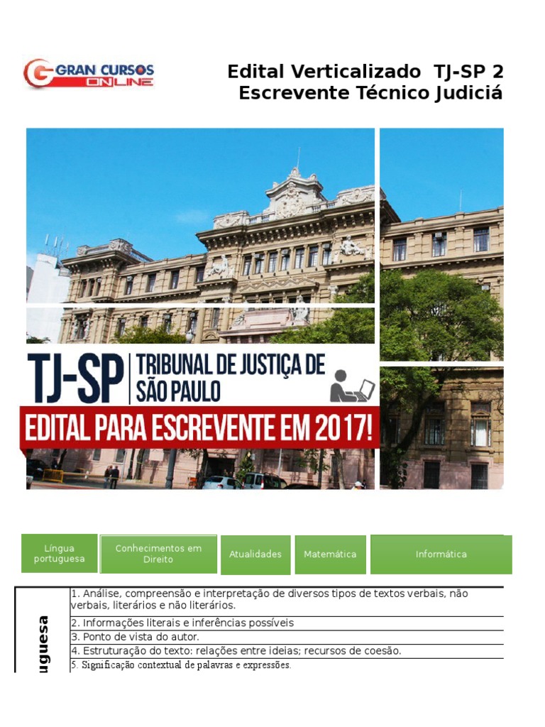 Jun 09, 2021 · concurso tjsp: Atualização de seu navegador de internet (windows, mac os e linux) google chrome Tjsp nº 769/2017 07 01 02 vídeo clique aqui e veja a análise do concurso tj sp! Somos curso online preparatório para concursos públicos, com pacotes construídos ponto a ponto do edital, com abordagem. Análise do edital tjsp 2017. Alto número de candidatos convocados chama atenção. O órgão se destaca por convocar muito além das vagas iniciais em todas as suas seleções. No vídeo abaixo o professor aragonê fernandes aborda o último edital detalhadamente e fornece dicas valiosas de estudo para o concurso tj sp. O histórico de convocações dos aprovados no edital tj sp para o cargo de escrevente técnico judiciário é uma das principais atrações do certame.